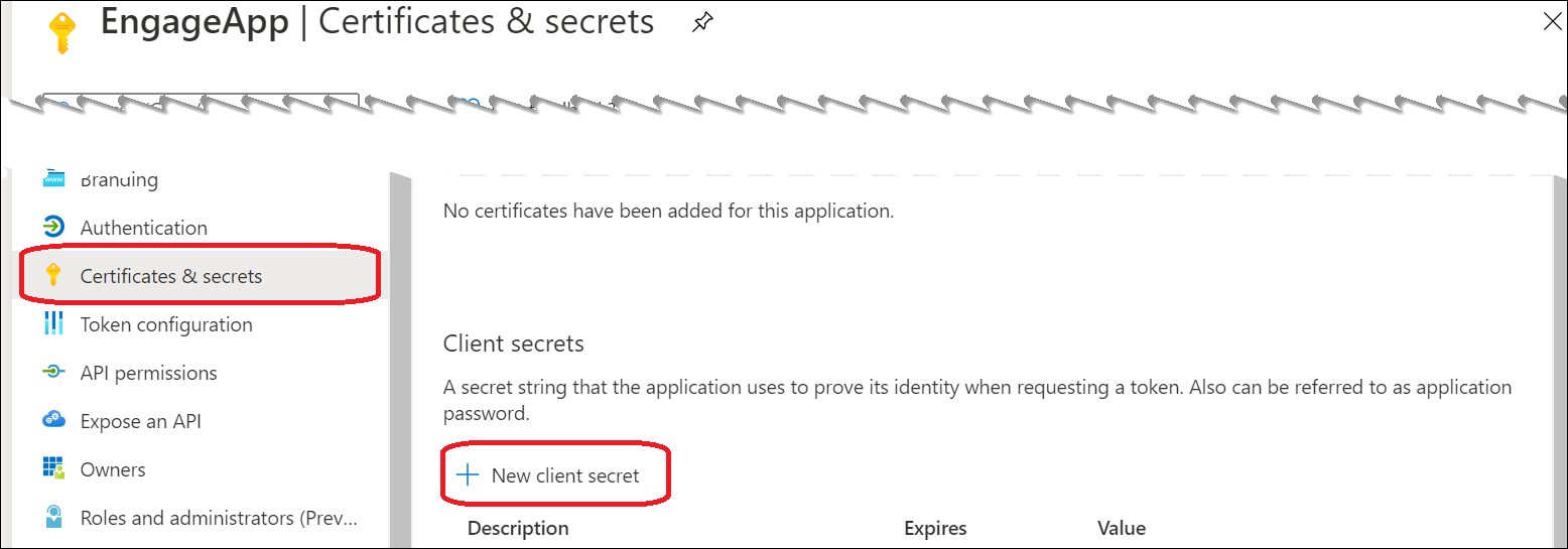 - To configure Certificates & secrets, select Certificates & secrets > New client secret.
