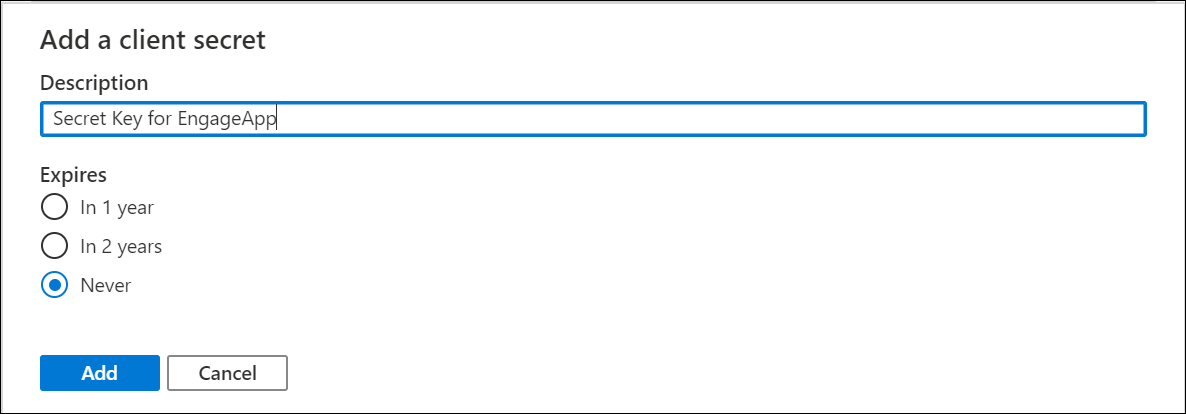 - Provide a description for the secret, and set the expiry. When done, click Add.