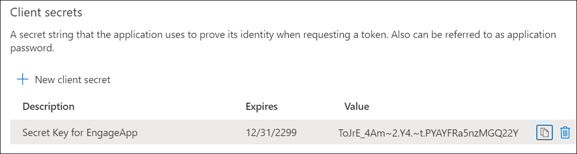 - After saving the client secret, its value will be displayed. Copy the value because you won't be able to retrieve the key later. You will need to provide the key value with the application ID to sign in to the application. Store the key value where your application can retrieve it.