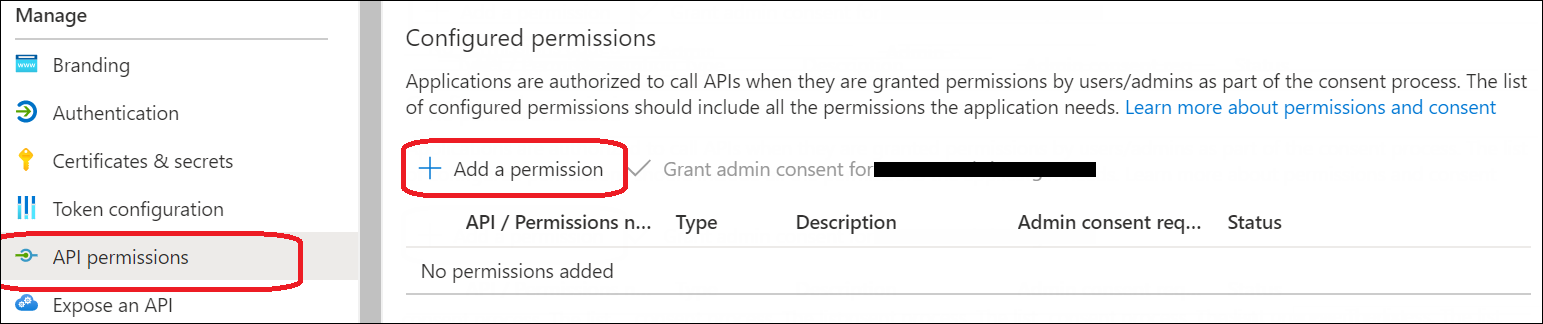 - To configure permissions, select API Permissions > Add a permission.