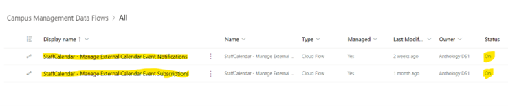 Go to PowerApps > Select the required Org > go to Solutions > Managed > double-click the Campus Management Data Flow solution. The Status of the following flows should be ON: