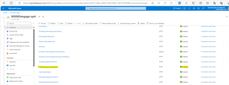 On the Azure portal, navigate to Function App > locate the required Org > Select <orgno>engage-<orgname> > go to Overview, and verify the HandleOutlookNotifications is Enabled.