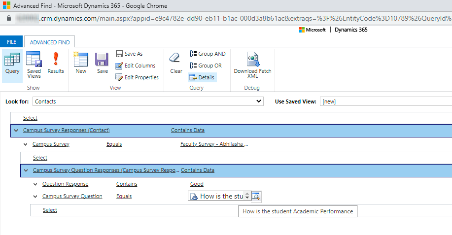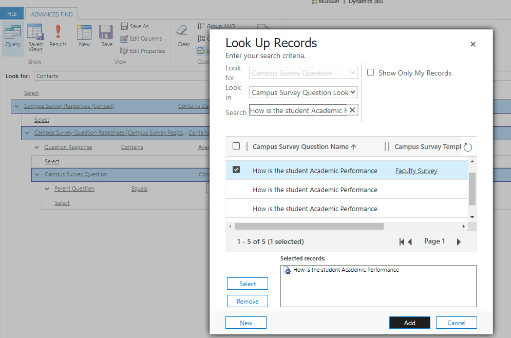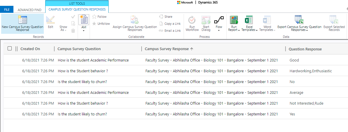 Institutions can create a query or a CRM list view using the campus survey question and campus survey response to generate a list of students for whom instructors have provided feedback in the Campus Survey form.