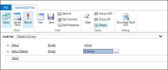 The following image illustrates a sample query for generating a list of surveys that are Overdue .