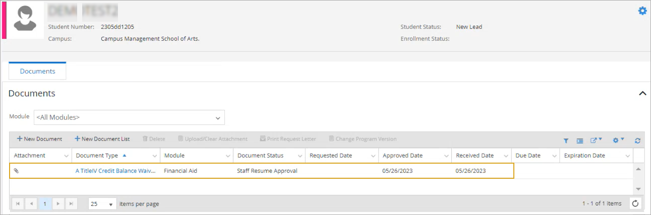 When a document is added or the document status is updated in Student Verification, the document appears as an attachment in Anthology Student under the student's profile > Contact Manager > Documents.