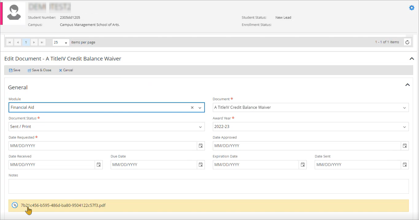 Document integration allows viewing a PDF document in Anthology Student that was uploaded in Student Verification.