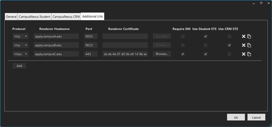 Installation Manager currently supports a single Student STS with multiple Renderer URLs. If an institution has set up additional binding URLs for Student STS instances (see example below), the additional STS URLs need to be manually updated in the <issuer> and <mapping> sections of the Renderer web.config file.