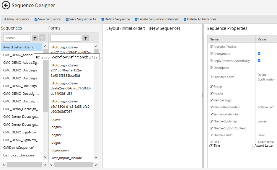 The Sequence Designer workspace is displayed when you select the Sequence Designer tile in the home page. This workspace enables you to create and edit form sequences. Closed