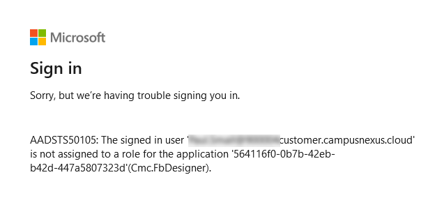 Users that are not in the staff group, for example students users created via the CreatePortalAccount workflow activity, will receive a messages similar to the examples below when they try to access the URL for Form Designer