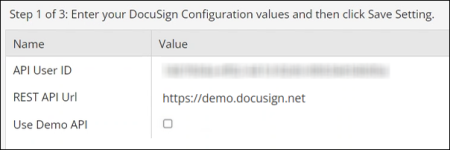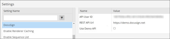 Customers wishing to integrate with DocuSign need to obtain their own licensing information with DocuSign to use in a live environment. Based on the customer’s location, DocuSign assigns a region and provides the API URL and credentials to the customer. This information needs to be updated in the Properties pane of the Settings screen for the DocuSign setting.