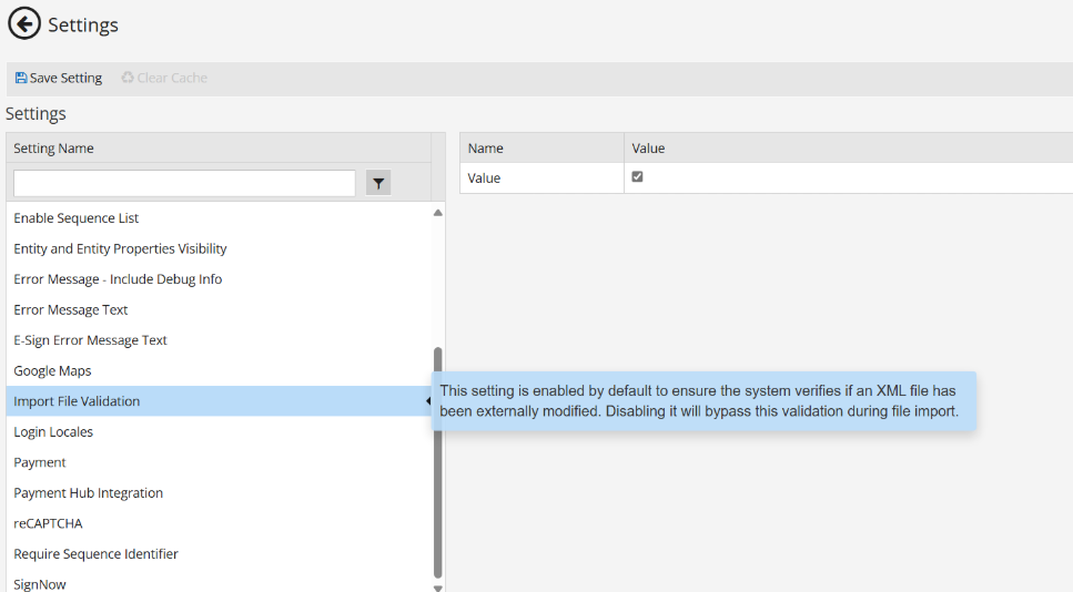 The Import File Validation setting ensures the system verifies whether an XML file has been externally modified during imports. By default, this setting is enabled to validate file integrity.
