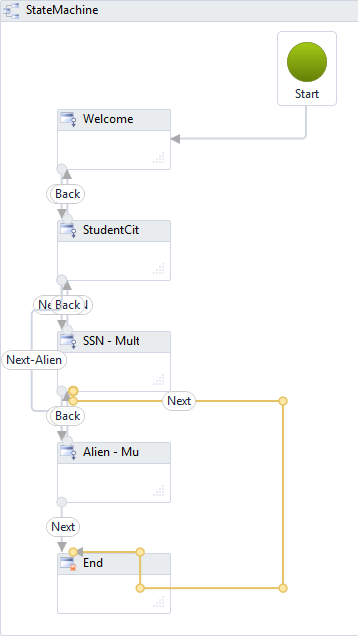 The Next transition on form A now points to the End state instead of form B.