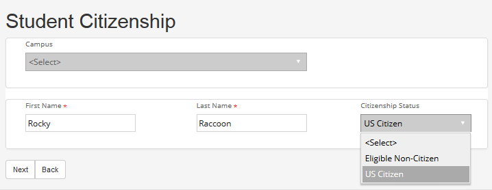 In our example the value selected in the Student - Citizenship drop-down list will trigger the branching.