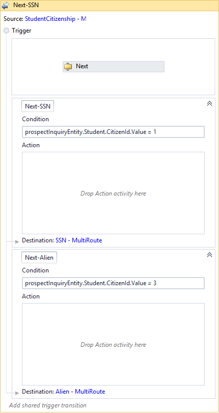 - In the Condition field for the Next-Alien transition, enter the decision input property derived from the main form. In our example the condition is the Eligible Non-Citizen value selected in the Citizenship Status field, i.e., prospectInquiryEntity.Student.CitizenId.Value = 3.