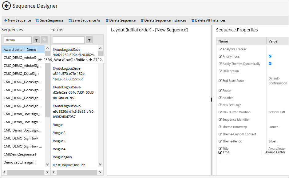 Use the search tool to find a saved form or scroll through the list. Select to filter the list. Drag forms into the Layout pane to build a sequence.When you hover over a form name, the form Id is displayed. |