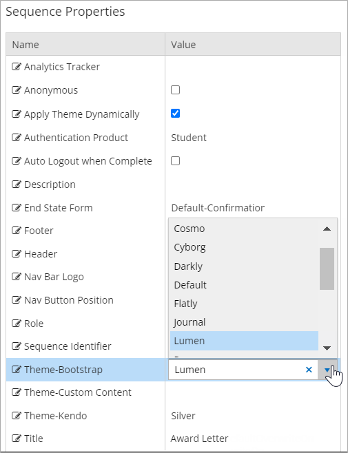 Custom bootstrap and custom Kendo themes selected in version 4.0 (or in prior versions) in the Sequence Designer will no longer be available. The following default values will be set for such sequences: