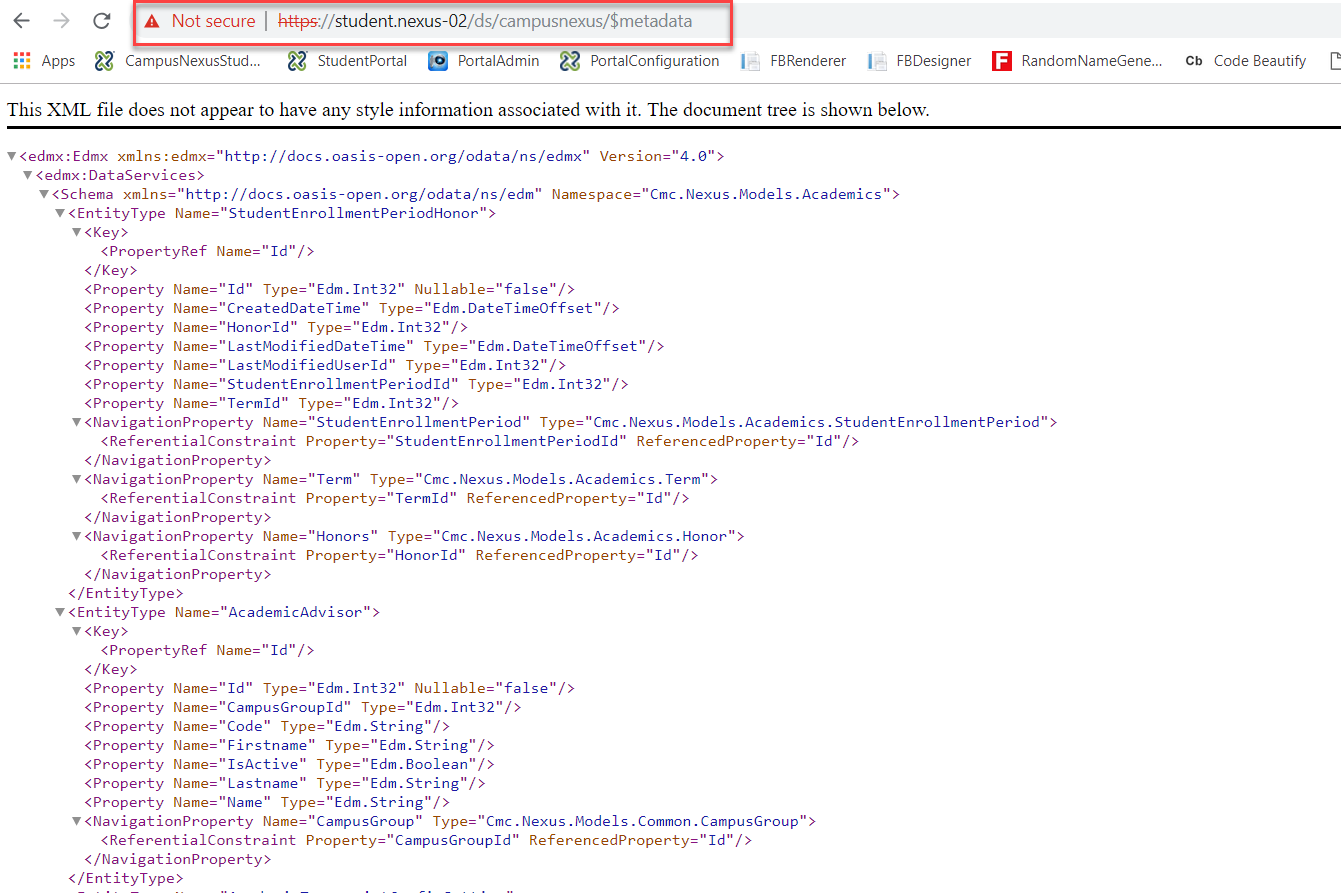 Access the Student Base URL in a browser. In our example, the Student Base URL is as follows with /ds/campusnexus/$metadata appended to the end of the URL to view the metadata values:
