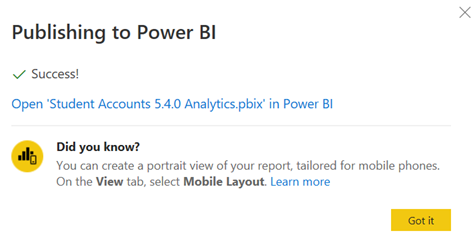 Click Got it on the publishing success message. The PBIX in our example contains a report and a data set that were published to the Analytics 5.4 app workspace.