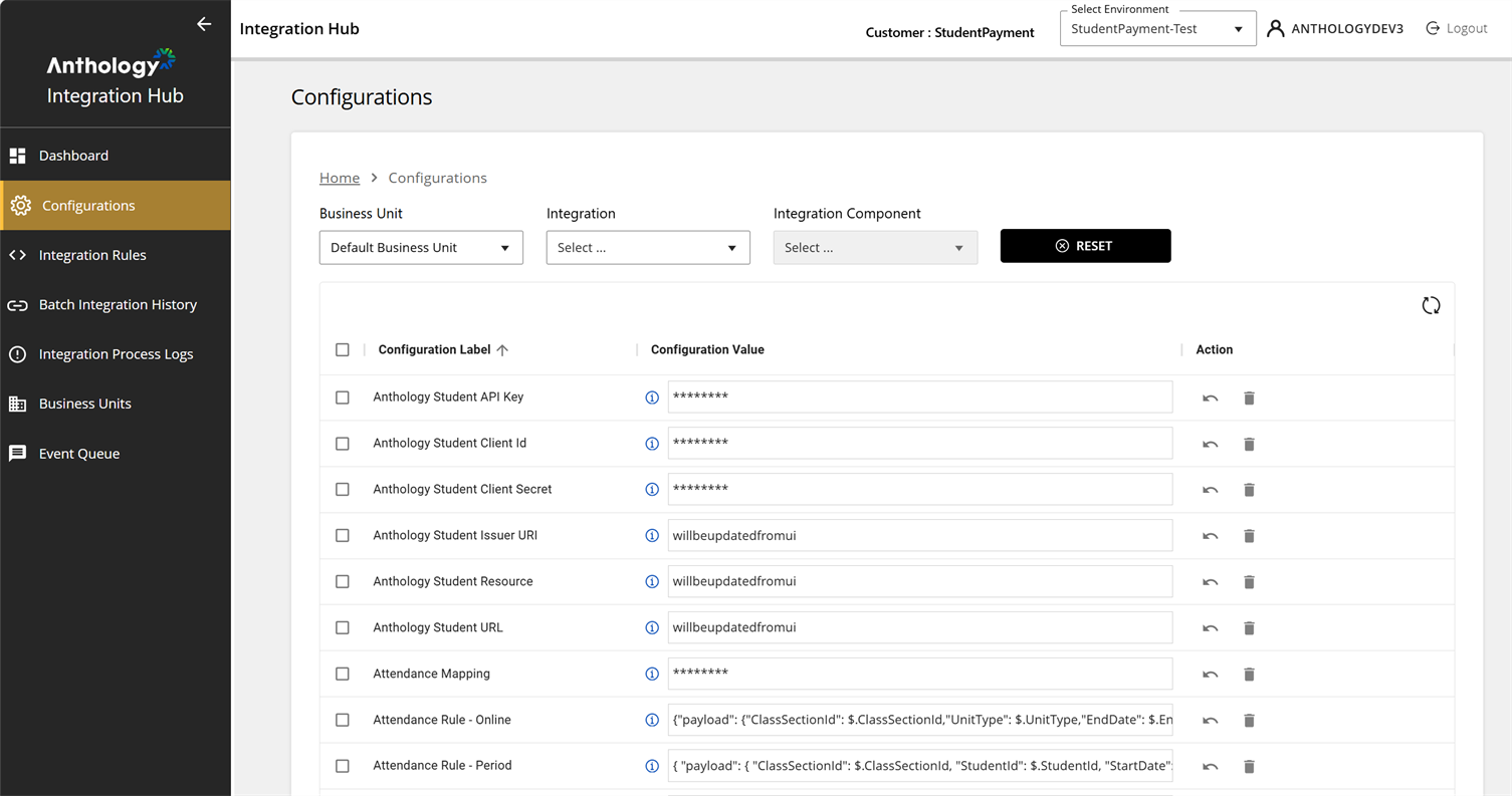 Anthology products will be deployed and integrated through the pipeline processes with default configurations. Staff members of the Anthology Professional Services team and customers will use the Configurations screen in the Integration Hub to review and edit the default configurations.