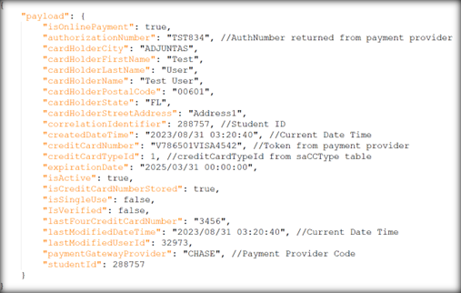 Below is the sample URL and payload to save a new credit card using the StudentCreditCard command API: