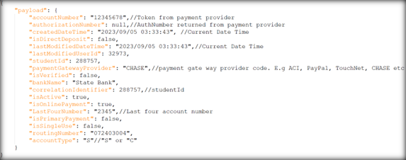 Below is a sample URL and payload to save a bank account using the StudentBankAccount command API.