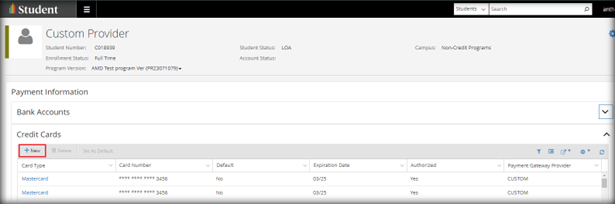 The New button in this UI will redirect to the specified custom payment provider Funding Page URL that is configured under Configuration > Student Accounts > Electronic Processors > Credit Card Payment Gateway Providers.