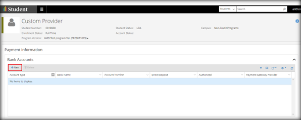 The New button in this UI will redirect to the specified custom payment provider Funding Page URL that is configured under Configuration > Student Accounts > Electronic Processors > ACH Payment Gateway Providers. The userid, studentid, and return URL will be passed as query strings. The passed URLs have been encoded.