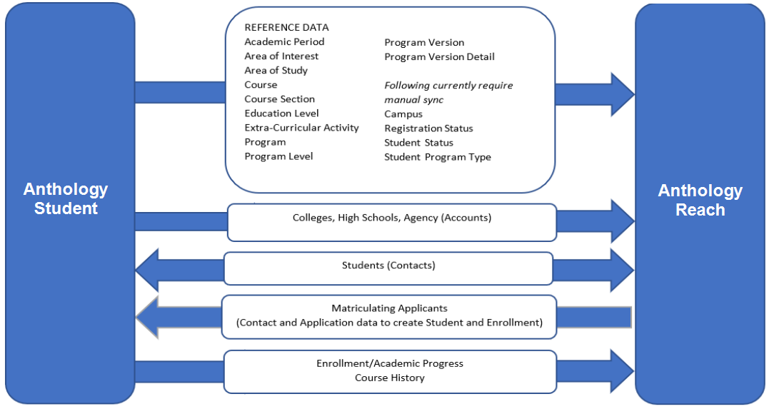 The data flow between Anthology Student and Anthology Reach is bidirectional for fully integrated entities such as Student and Contact. The data transfer is unidirectional for Reference data such as Programs, Academic Periods, and Course History. Reference data can be used as a look-up field within other entities. Some Reference data requires manual synchronization between the systems.