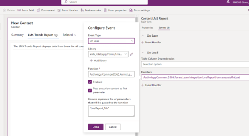 In the Function field, specify Anthology.Common.D365.Forms.LearnIntegration.LmsReportForm.executeOnLoad