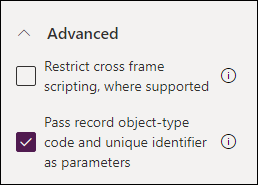 In the Web resource Properties > Advanced, select the check box, Pass record object-type code and unique identifier as parameters.
