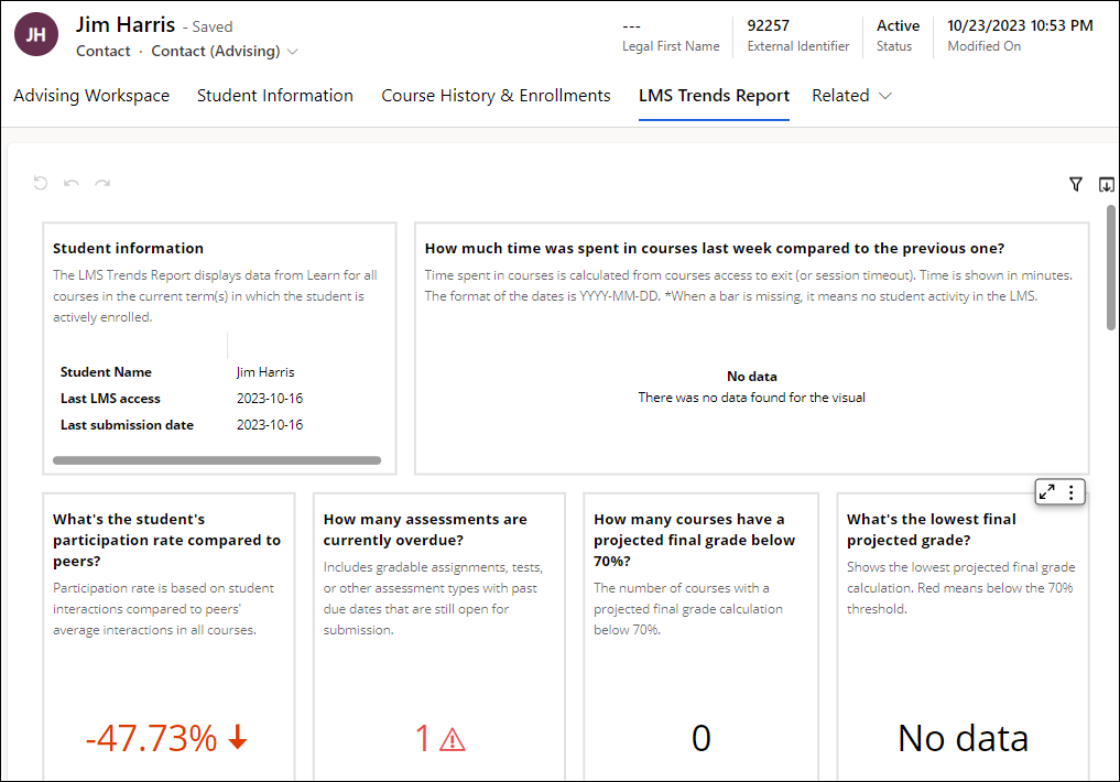 When the LMS Trends Report is enabled in Anthology Reach, the out-of-the-box Contact (Advising) form displays the LMS Trends Report tab, which provides advisors and coaches access to detailed and timely information about student's course performance and engagement at their fingertips.