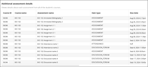 | Additional assessment details | Shows details about each assessment from all the student’s courses. Includes course ID, course name, assessment name, item type, due date, submission date, student’s grade, and peer’s average grade. |