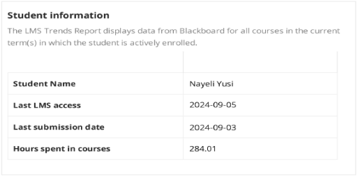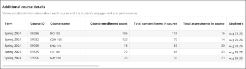 | Additional course details | Shows additional information about each course and the student's engagement and performance. Includes term, course ID, course name, course enrollment count, total content items in course, total assessments in course, student’s first access, student’s projected final grade, student’s engagement score, and engagement score status. |