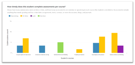 | How timely does this student complete assessments per course? | Shows how many submissions were on-time or late, and how many assessments are overdue or upcoming in each course the student is enrolled in. Assessments include anything that needs grading and has a due date: assignments, tests, surveys, or even discussions, blogs, and journals. |