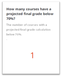 The number of courses with a projected final grade calculation below 70%. Projected final grade is the final grade in the gradebook. This metric is a count of courses where the final grade is below .70. |