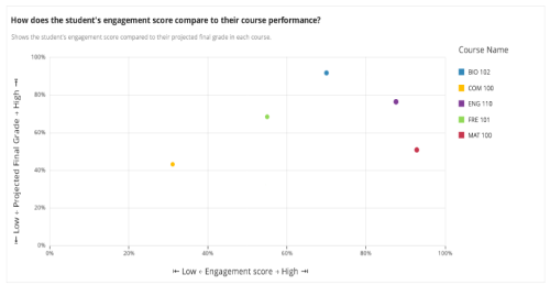 | How does the student’s engagement score compare to their course performance? | Shows the student's engagement score compared to their projected final grade in each course. |