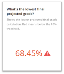 Shows the lowest projected final grade calculation. Red means below the 70% threshold. Projected final grade is the weighted average grade in the gradebook. This chart displays the lowest final grade from all the students’ active courses in the current term. |