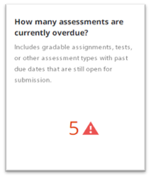 Includes gradable assignments, tests, or other assessment types with past due dates that are still open for submission. Assignments are considered overdue when the attempted time is null and the current time is greater than the due date time. |