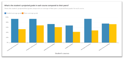 | What's the student's projected grade in each course compared to their peers? | Shows the student's projected final grade compared to an average of their peers' projected final grades for each course. |