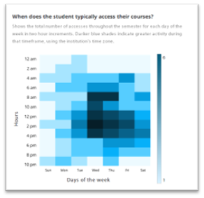| When does the student typically access their courses? | Shows the total number of accesses throughout the semester for each day of the week in two hour increments. Darker blue shades indicate greater activity during that timeframe, using the institution's time zone. *When a day is missing, it means no student activity in the LMS. |