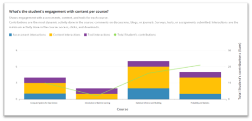 Shows engagement with assessments, content, and tools for each course. Contributions are the most dynamic activity done in the course: comments on discussions, blogs, or journals. Surveys, tests, or assignments submitted. Interactions are the minimum activity done in the course: access, clicks, and downloads. |