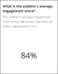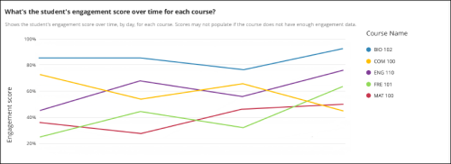 | What’s the student’s engagement score over time for each course? | Shows the student's engagement score over time, by day, for each course. Scores may not populate if the course does not have enough engagement data. |