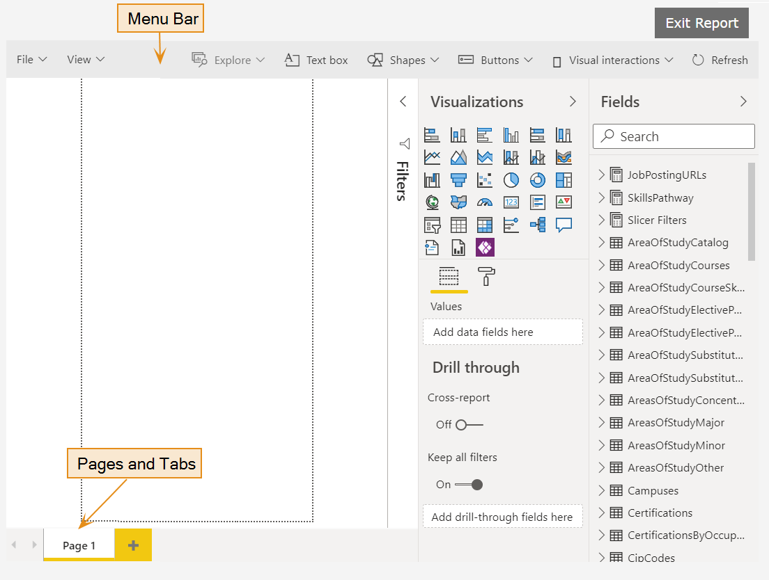 The main area of the report is the canvas. You edit the report in the canvas by adding or removing elements, applying formatting, or changing the layout of elements on the canvas.