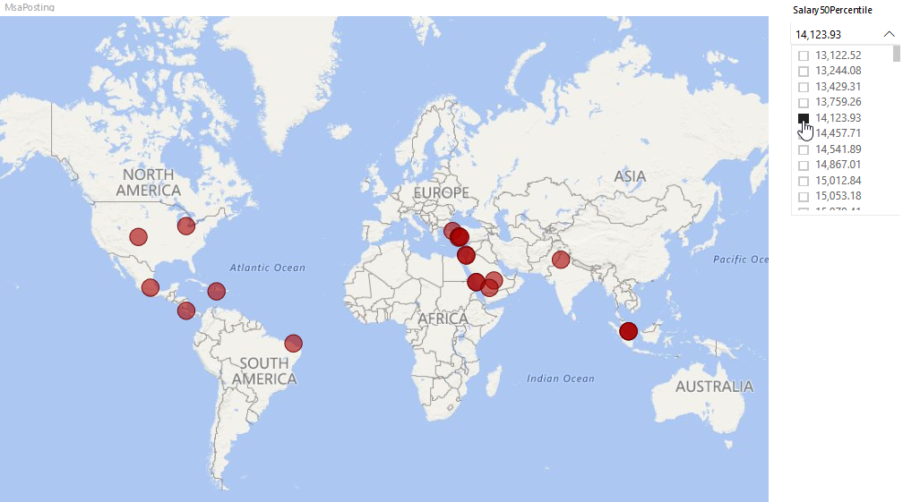 In our example, we placed the slicer next to the map of MsaPostings and selected the Dropdown option for Salary50Percentile data.