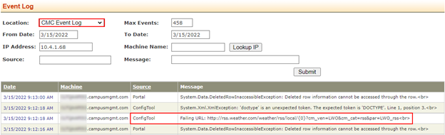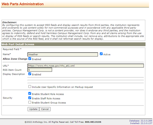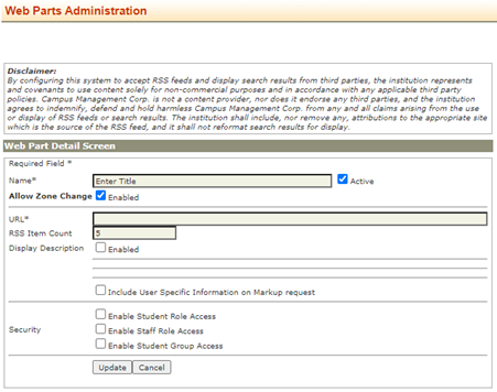 Portal administrators can now manage the RSS feed functionality when the source URL of a feed changes. For example, if an RSS feed (e.g., Weather, News, etc.) is enabled in the Student Portal home page, but the source URL of the feed is no longer valid , the system will inactivate such feeds and capture the error in the CMC Event Log in Portal Admin Console. An Administrator can update the source URL and enable the automatically disabled RSS feed or remove them. This will prevent invalid or disabled RSS feeds from causing recurring errors caused by repeated attempts to reach the feed URL.