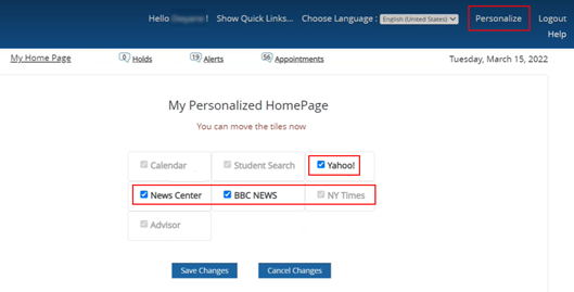 For example, the RSS feeds for Yahoo, New Center, BBC News, and NY Times are set to active in the Portal Admin Console. When students personalize their home pages, they can select these feeds. Any RSS feeds that are configured in the Portal Admin Console as inactive will not be listed as options for selection and will not be displayed on the home page.