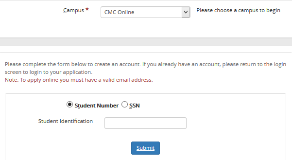 If you are already a student at the selected campus, enter your Student Number or SSN so that your account can be associated with your existing student information.