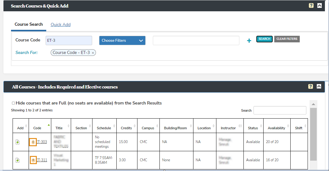 Note: The search criteria can be the Course Code or/and the values under Choose Filters.