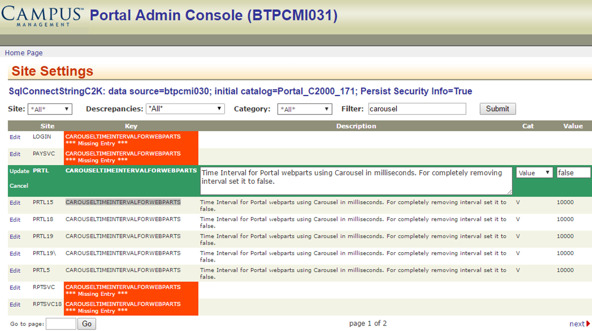 You can set the carousel in the Admin console under Site Settings. Search for “CAROUSELTIMEINTERVALFORWEBPARTS”.