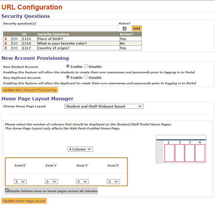 With the addition of tiles-based web parts, the following modifications can be made to the Home Page Layout Manager in the Portal Configuration tool. The Portal Configuration tool is also updated with few more settings where users can customize the tiles that are shown in the Portal when the layout is selected as Student Only Tile Based Layout (customizable).